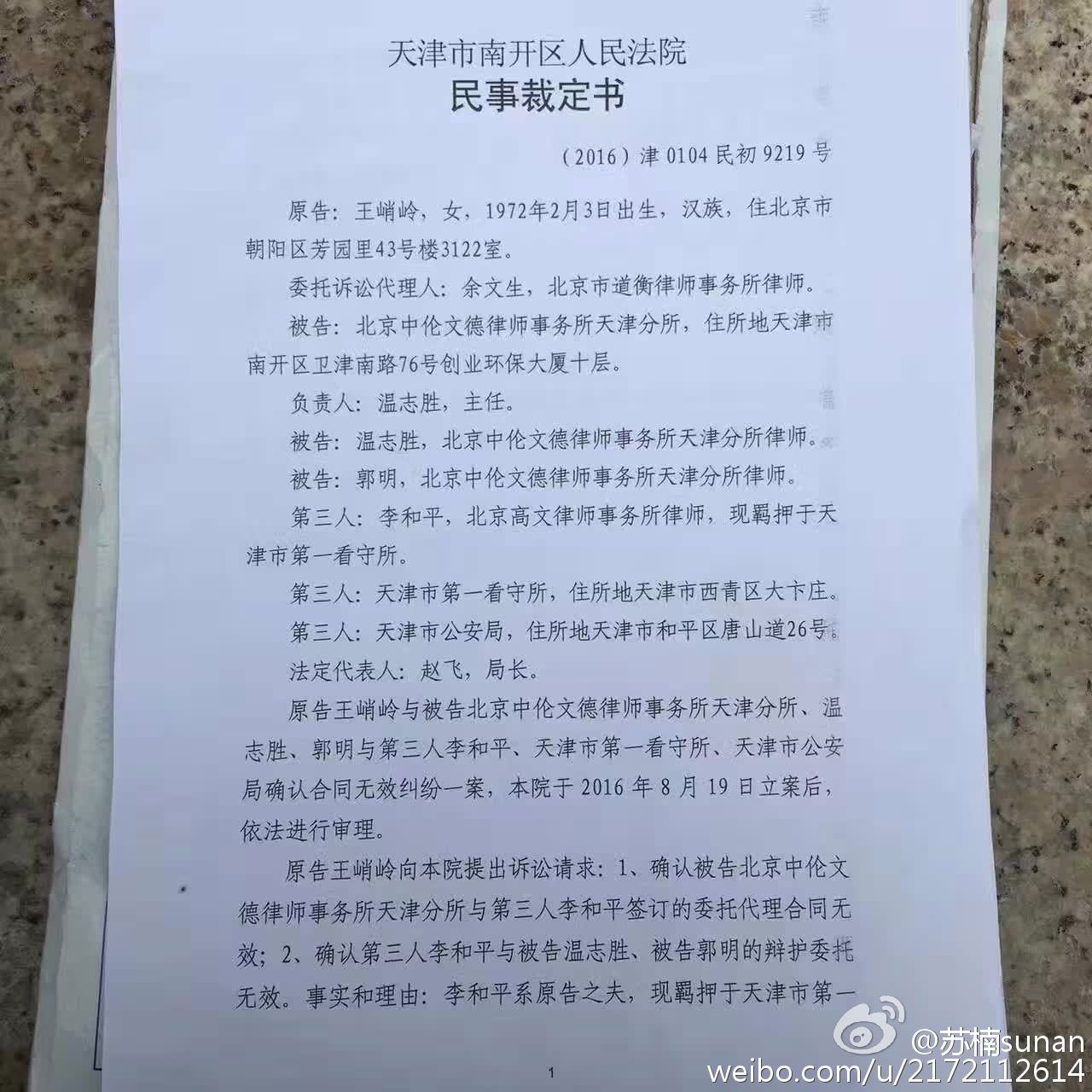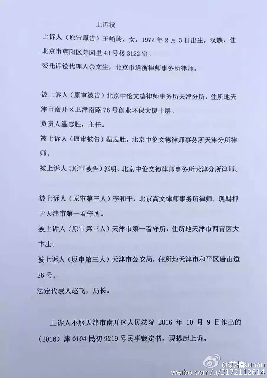 今王峭岭就起诉中伦文德天津所温志胜、郭明两官派律师的“驳回起诉”的裁定,在天津市南开法院上诉立案成功。温和郭是709案李和平律师的官方强行指定的律师。