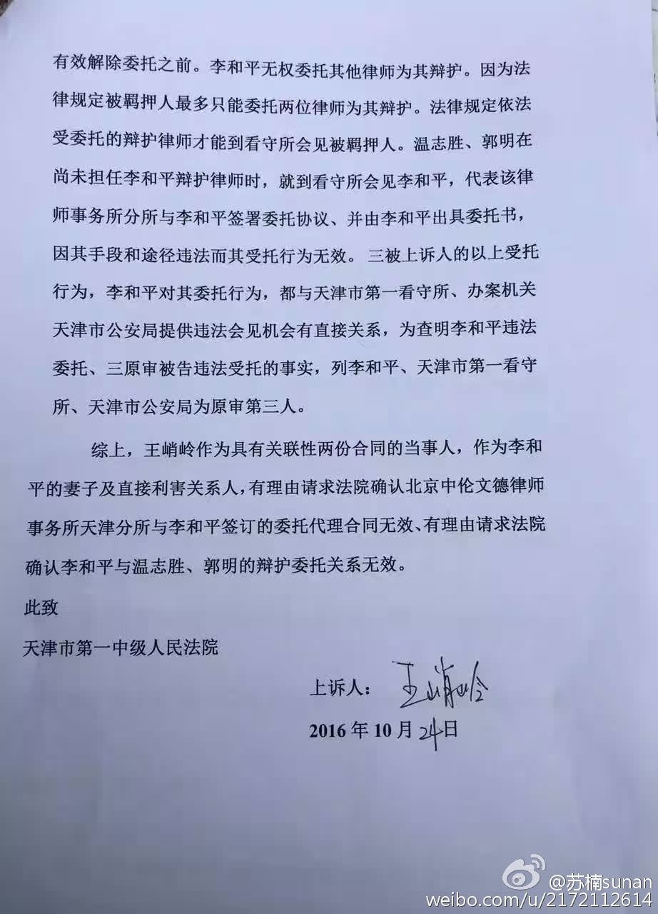 (维权网信息中心报道)2016年10月24日,本网获悉:709案李和平律师妻子王峭岭起诉官派律师上诉获立案成功。