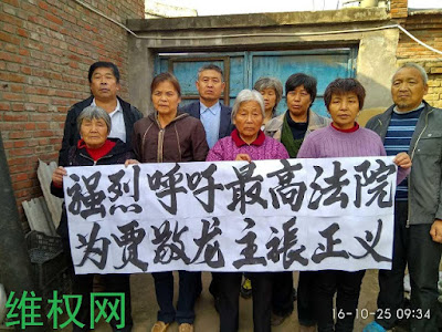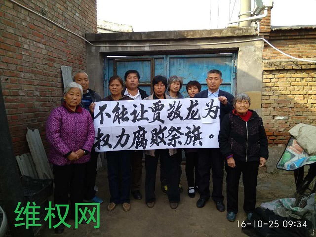 为了拯救已处被错杀悬崖边的贾敬龙,在京维权人士由河北保定的蔡志国、黑龙江鹤岗市的王清臣、辽宁抚顺市的赵振甲、河南涡阳的张素珍、河南焦作的陈秀莲、河南洛阳的张爱云、许桂芳、河南汝州的陈巧玲、以及河南洛阳的李三虎、胡大料夫妇等,特意在六中全会的第二天拉“不能让贾敬龙为权力腐败祭旗”“强烈呼吁最高法院为贾敬龙主张正义”的横幅,期待中共六中全会“从严治党”从撤销与纠正贾敬龙死刑核准案开始!