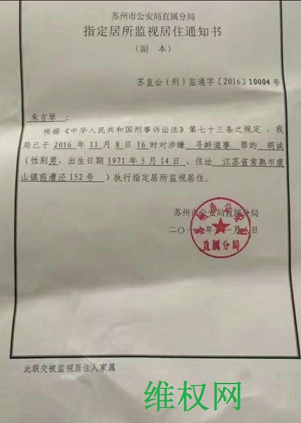 (维权网信息中心报道)2016年11月9日,本网获悉:截止今日共有9名维权人士遭指定居所监视居住。分别是:胡诚、戈觉平陆国英夫妇、顾义民、王婉平、王明贤、朱雪英、吴其和、徐春玲。