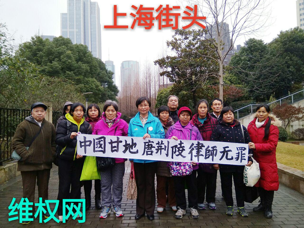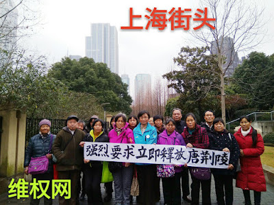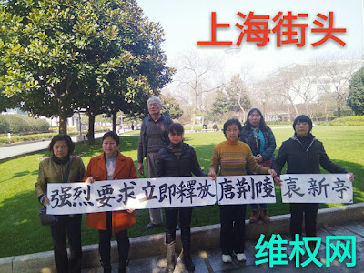 (维权网信息中心报道)2017年1月30日,本网获悉:春节期间,上海人权捍卫者王燕亭、周洪宝、魏勤、徐佩玲、顾学群、丁菊英、张惠仙、陈桂英、蔡晓红、唐霞珍、胡伯森、韦开珍、郑培培、吴玉芬、陈国英、彭妙林、王宝妹、朱金娣、陈建芳等持续上街举牌声援被政治迫害坐牢已2年8个月的广州三君子中的唐荆陵和袁新亭(王清营获刑2年6个月已刑满释放)。