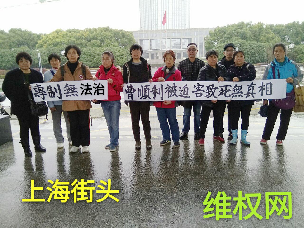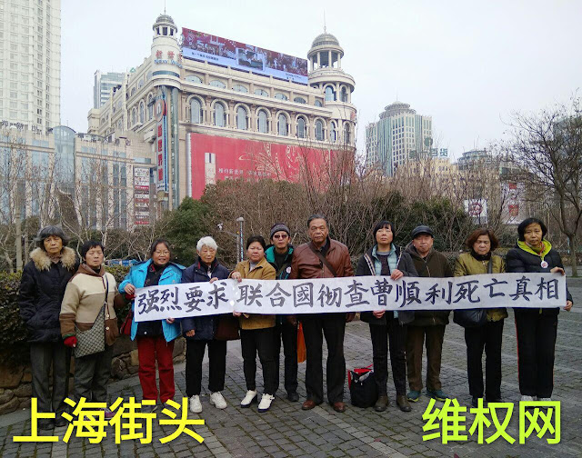 (维权网信息中心报道)2017年1月30日,本网获悉:在这亲朋好友举杯同庆春节的喜庆日子里,上海街头的人权捍卫者郑培培、邱蓓、魏勤、孙洪琴、颜秀英、刘淑珍、周洪宝、王燕亭、王宝妹、张平、吴玉芬、谢金华、周炎、丁菊英、唐霞珍、申琴芳、王佩云、王宗泽、朱金娣、陈建芳等与北京街头的人权捍卫者怀着沉痛的心情以上街举牌的方式悼念被迫害致死近3年无死亡真相的人权捍卫者曹顺利女士。